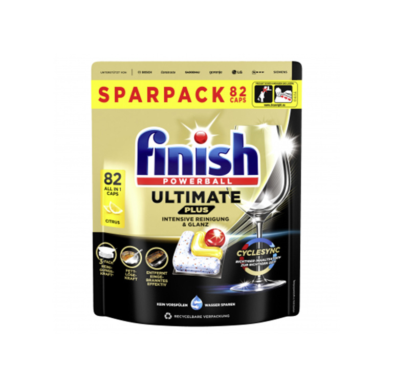 Finish Powerball Ultimate Plus Lemon nõudepesumasina kapslid. Finish Ultimate Plus All in One kapslid tagavad intensiivse puhastuse ja teemantläike esimesel korral ja iga kord. See on meie esimene CYCLESYNCTM-tehnoloogiaga kapsel, mis vabastab õige koostisosa*, et see toimiks õigel ajal. Selle täiustatud koostis võitleb ilma eelloputuseta isegi sissekõrbenud plekkidega, pakkudes 4 toimingut kogu pesutsükli jooksul. Kapslid kaitsevad ja hooldavad teie klaasnõusid ja söögiriistu, säilitades nende sära pesu pesu järel. Murranguline tulemuslikkus 15% väiksema keemikaalide osakaaluga võrreldes Finishi traditsiooniliste tablettidega.