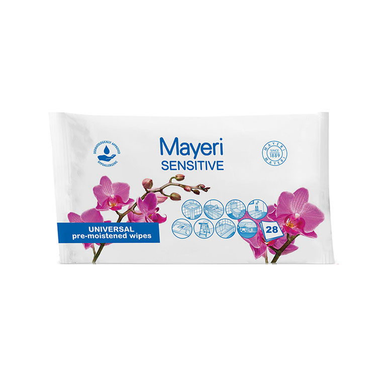 Universaalsed niisutatud puhastuslapid Mayeri Sensitive. Niisutatud salvrätikud kõigi veekindlate pindade puhastamiseks. Ei sisalda lõhna- ega värvaineid. Eemaldab tõhusalt rasva ja mustuse. Ei vaja täiendavat loputamist.d ning on sobilik kasutamiseks allergikutele või tundliku nahatüübiga tarbijatele.