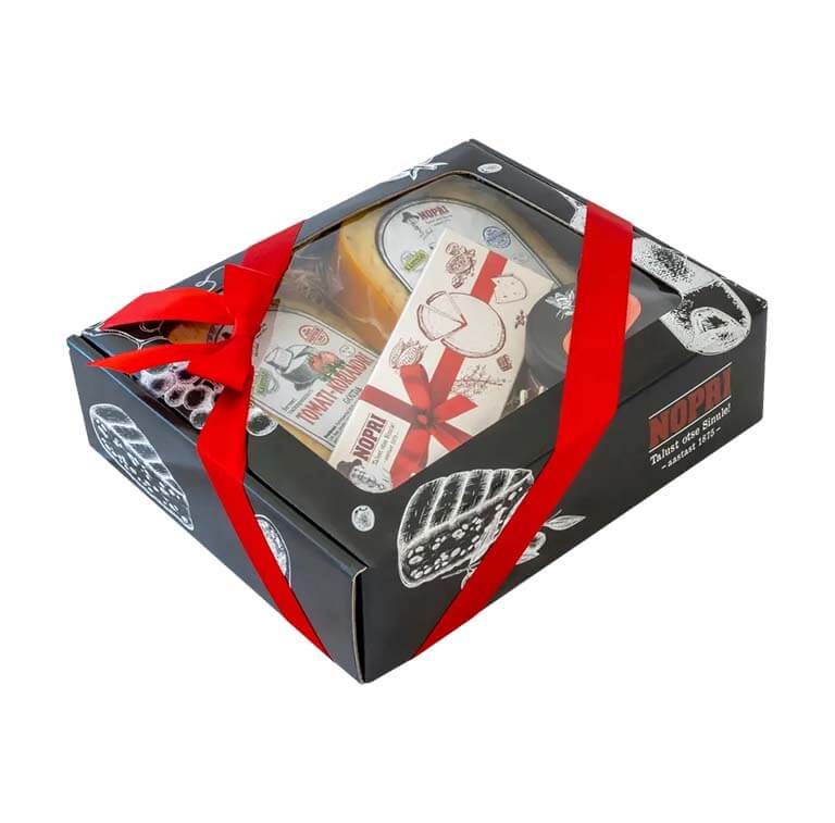 Pakend: kinkekarp, juustud vaakumpakendis, mesi klaaspurgis, šokolaad pappkarbis